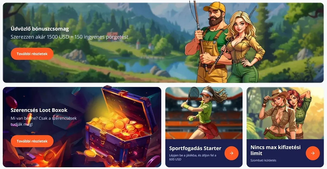 Az oldalon minden új játékost egy akár 450.000ft értékű üdvözlő csomaggal fogadnak, amelyhez 150 ingyenes pörgetés is tartozik. Emellett a magyar játékosok számára cashback, reload és VIP bónuszok is igényelhetők, így az izgalmas és jövedelmező szórakozás garantált. Az alábbiakban részletesen bemutatjuk számodra a kaszinóban található promóciós ajánlatokat és a hozzájuk tartozó követelményeket.